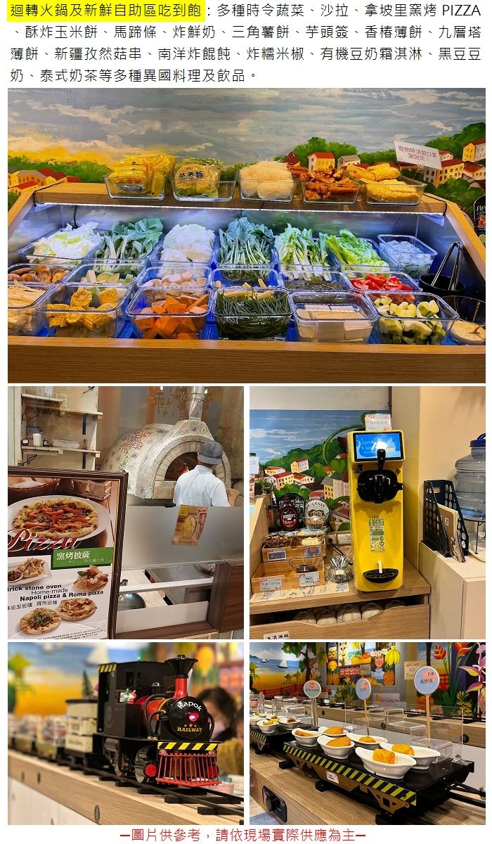 迴轉火鍋及新鮮自助區吃到飽:多種時令蔬菜、沙拉、拿坡里窯烤PIZZA、酥炸玉米餅、馬蹄條、炸鮮奶、三角薯餅、芋頭簽、香椿薄餅、九層塔薄餅、新疆孜然菇串、南洋炸餛飩、炸糯米椒、有機豆奶霜淇淋、黑豆豆奶、泰式奶茶等多種異國料理及飲品提供。