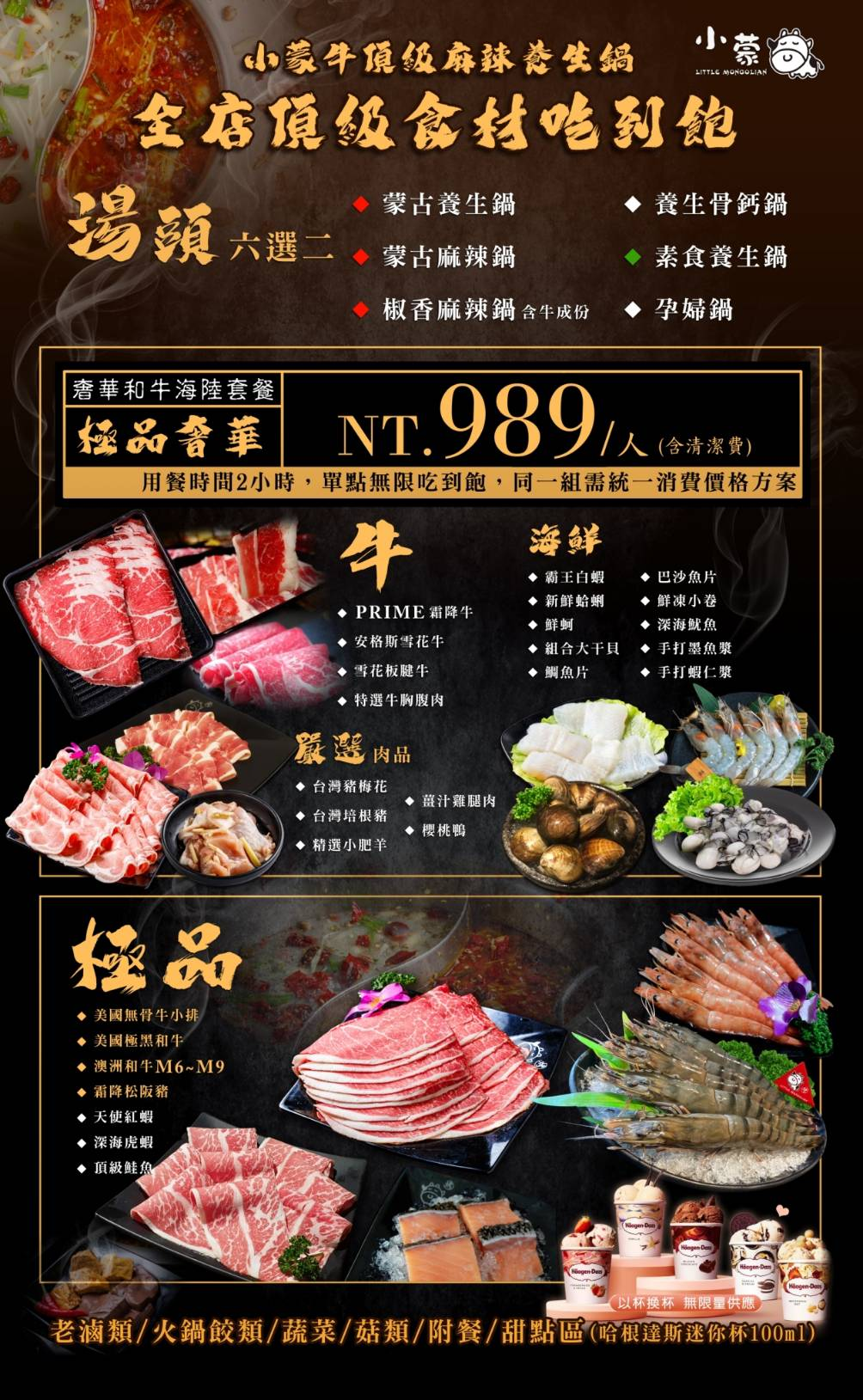 《小蒙牛麻辣養生火鍋》挾大漠風味養生湯頭加上頂級牛肉,征服老饕的味蕾,且不斷的創新改進,只為了讓貴賓們品嚐到更好更美味的鍋食美餚。《小蒙牛》香醇湯頭的秘密乃精燉八小時高湯,源自於大陸蒙古草原的蒙古藥膳火鍋,有別於四川麻辣口感,以各種植物搭配豬大骨,加入紅棗、枸杞、桂圓...等草本植物熬煮而成。