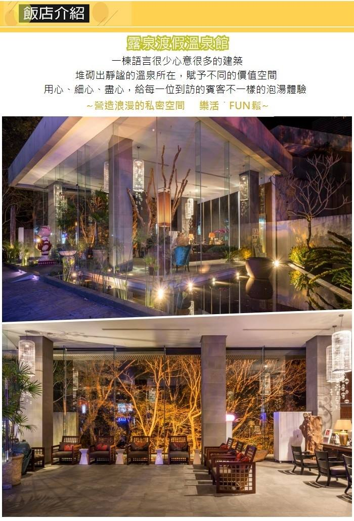 1.單券限2人於露泉渡假溫泉館使用精緻湯屋乙次,加價$200可升等景觀湯屋;依現場排房為準,恕不得指定,不提供一次性備品。
