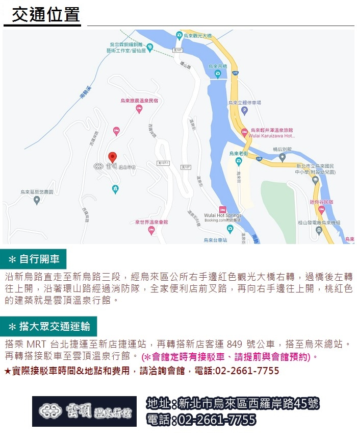 從烏來觀光大橋向右轉,沿著環山路轉個彎,在西羅岸路右轉上山,享受芬多精,同時,遠離都市的喧囂,多的是蟲鳴鳥叫和清山绿意盎然。