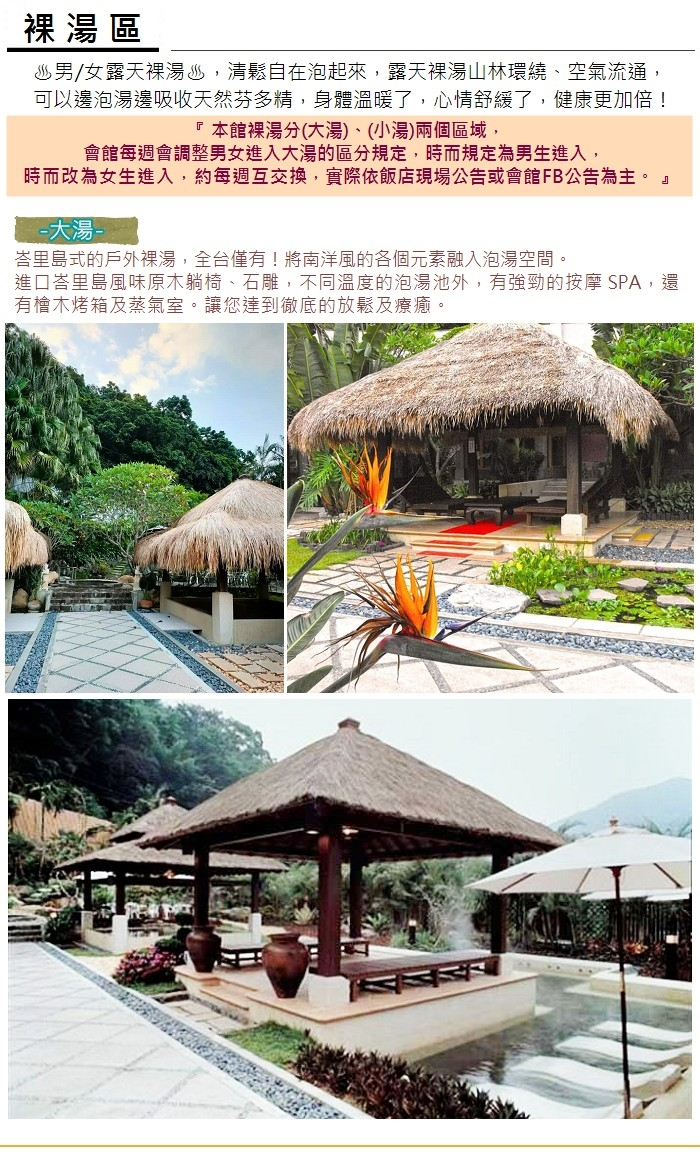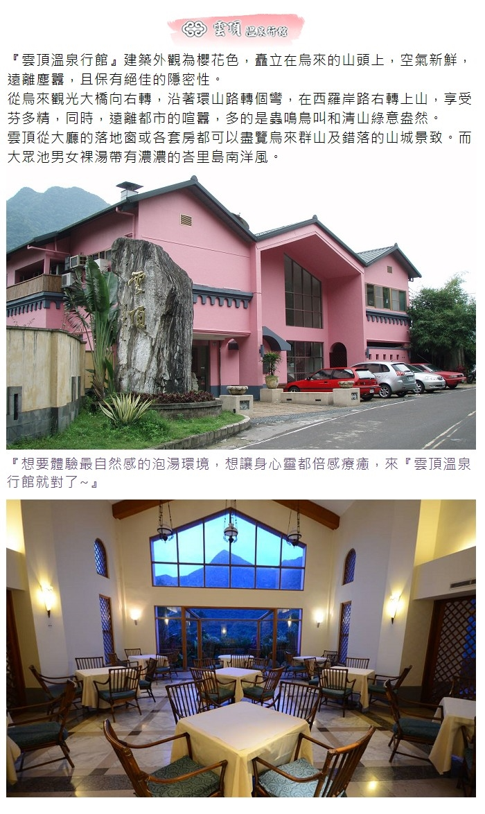 1.本券可單人使用烏來雲頂溫泉行館男或女(裸湯)泡湯乙次,當日使用不限時。