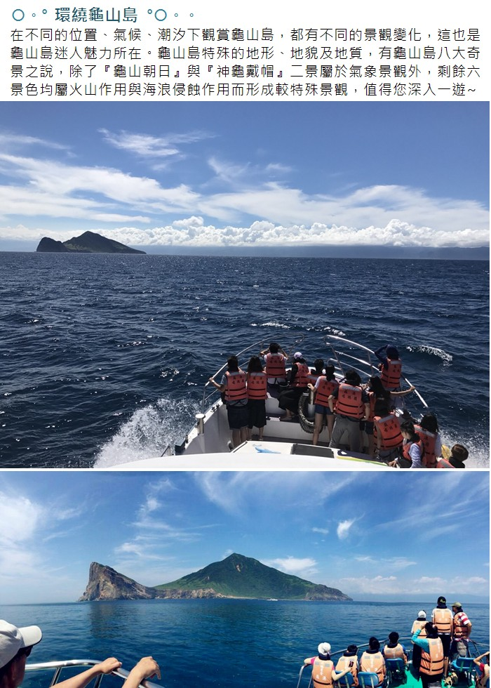 龜山島不僅是台灣三大漁場之一,也是鯨、豚迴遊必經之路,來到這裡,既能欣賞到可愛的鯨豚在海中跳耀,同時也能觀賞到整座龜山島的美麗景色。在專業的解說下,這趟旅程不僅獲得知識,同時也充滿趣味!不管是情侶共遊,還是親朋好友一起前來,都將是一次難忘的回憶喔!看著湛藍海水,奮力躍起的鯨魚和海豚,讓我們跟隨著牠們的腳步,航向龜山島,與牠們一起共舞吧!