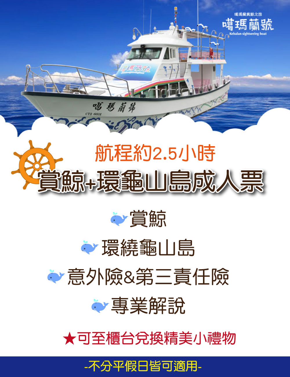 1. 本券可單人搭乘噶瑪蘭號賞鯨船(或同業賞鯨船),航程約2.5小時,內含賞鯨+環繞龜山島+意外險+第三責任險+專業解說乙次,並可至櫃台兌換精美小禮物。(每人每次限用乙張,恕無法與他人併用)