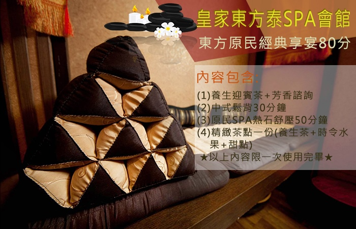1.本券可單人(不限男、女)於皇家東方泰SPA會館各分店使用東方原民經典享宴一次共80分鐘。