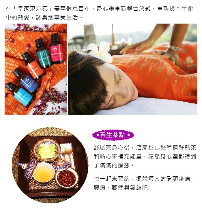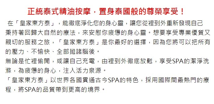 在【皇家東方泰】,能徹底淨化您的身心靈,讓您從裡到外重新發現自己。在SPA的過程中,您不僅能拾回美麗與健康的秘訣,並且沉浸滿足在五感享受的氛圍裡。【皇家東方泰】尊貴舒適的環境,使您能安心的體驗優質SPA。我們秉持著回歸大自然的療法,來安慰你疲憊的身心靈。想要享受專業優質又親切的服務之旅,【皇家東方泰】是你最好的選擇,因為您將可以把所有的壓力、不愉快、全部拋諸腦後。無論是忙裡偷閒,或讓自己充電,由裡到外徹底放鬆,享受SPA的潔淨洗滌,為疲憊的身心,注入活力泉源。
