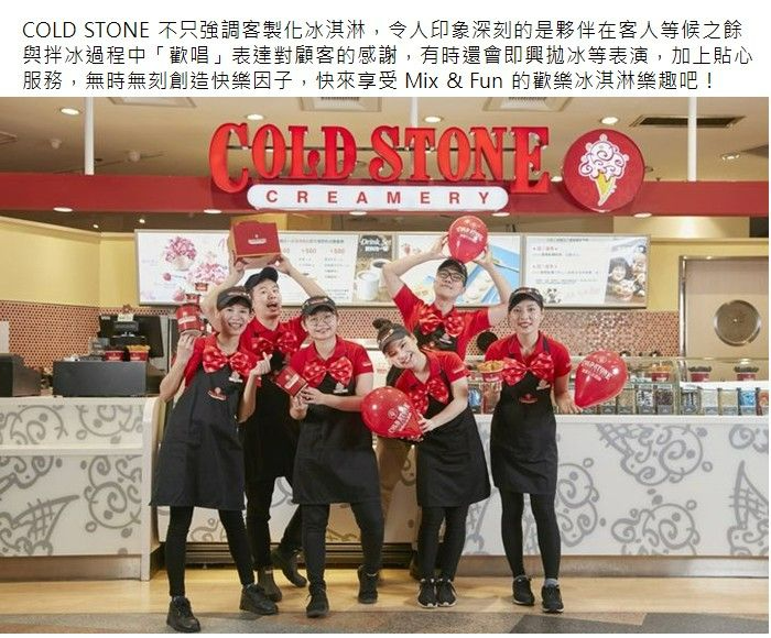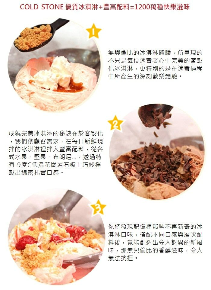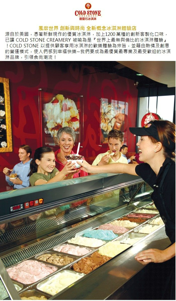 源自於美國,憑著新鮮現作的優質冰淇淋,加上1200萬種的創新客製化口味,已讓 COLD STONE CREAMERY 被喻為是『世界上最無與倫比的冰淇淋體驗』!COLDSTONE 以提供顧客享用冰淇淋的歡樂體驗為宗旨,並藉由熱情及創意的營運模式,使人們感到幸福快樂~我們要成為最優質最專業及最受歡迎的冰淇淋品牌,引領食尚潮流!