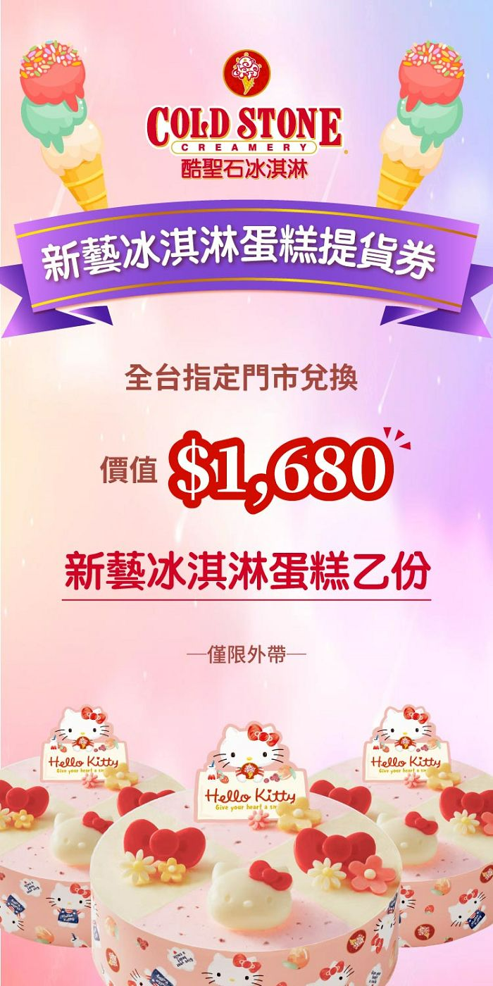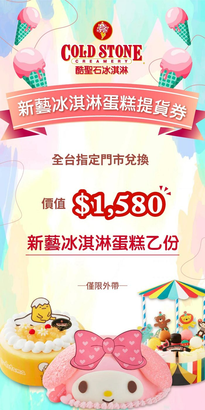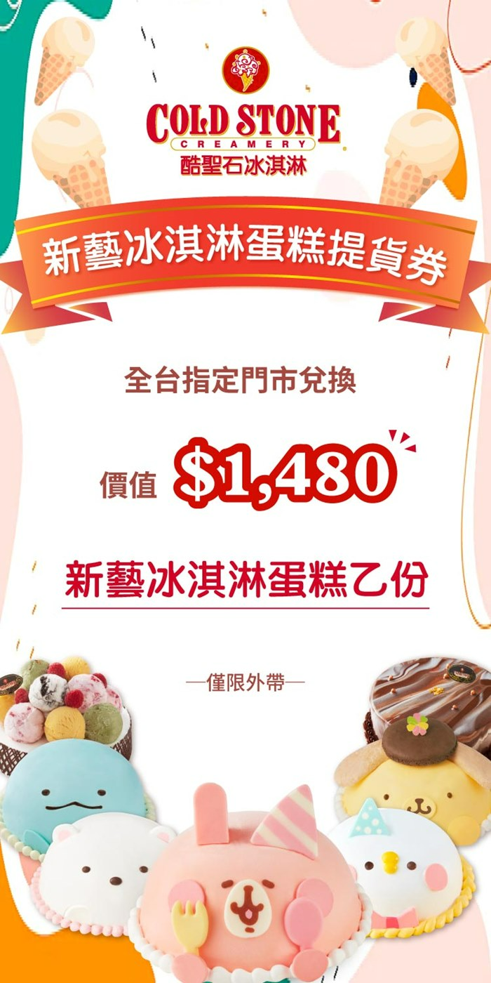 單張可於酷聖石冰淇淋全台指定門市兌換價值$1680新藝冰淇淋蛋糕乙份(僅限外帶),如欲兌換價格高於$1680或兌換時價格調漲,請依實際訂價補價差。