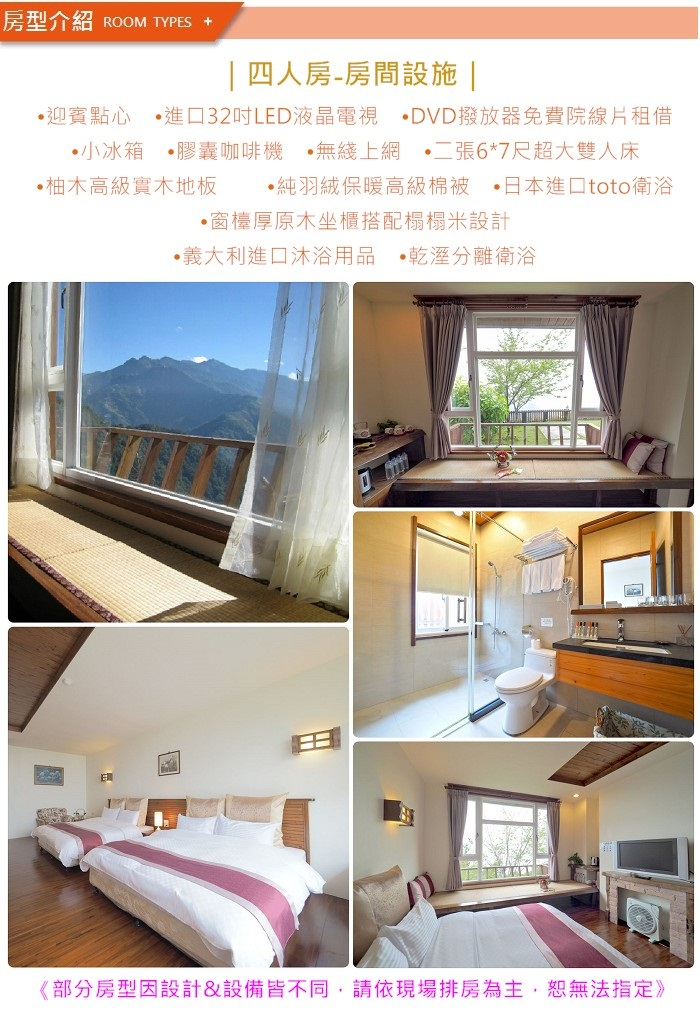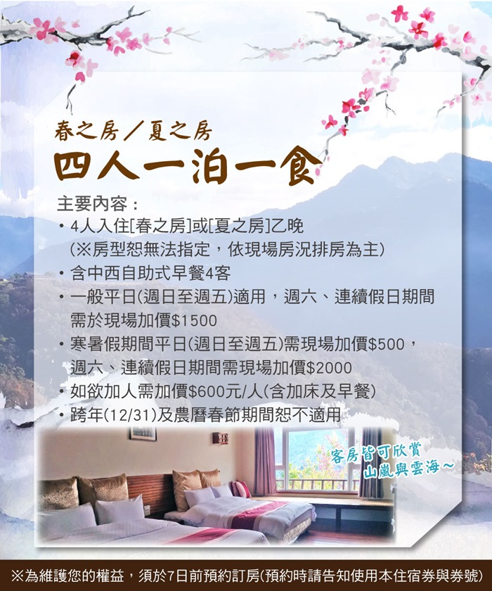 1.單張可4人入住[春之房]或[夏之房]乙晚(※房型恕無法指定,依現場房況排房為主),含中西自助式早餐4客。
