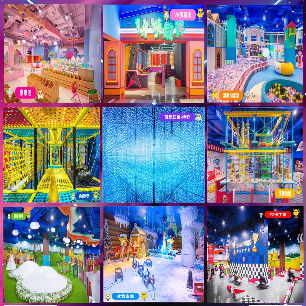 家家酒- 佔地300坪,Mini Size生活場景、購物體驗、角色扮演換裝遊戲,在家家酒中學習生活和社交技能;環保塑粒雪花沙池、天然小木粒沙池、VR互動牆加球池、滑步車等,充分訓練大小肌肉發育;小小孩的玩樂王國!