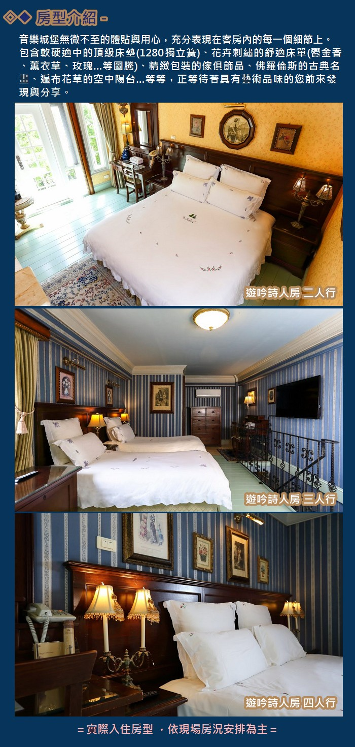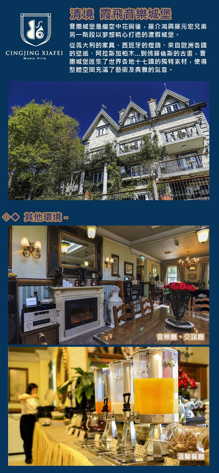 1.本券可雙人入住清境音樂城堡-遊吟詩人雙人房乙晚,含早餐兩客及品酒券兩張。