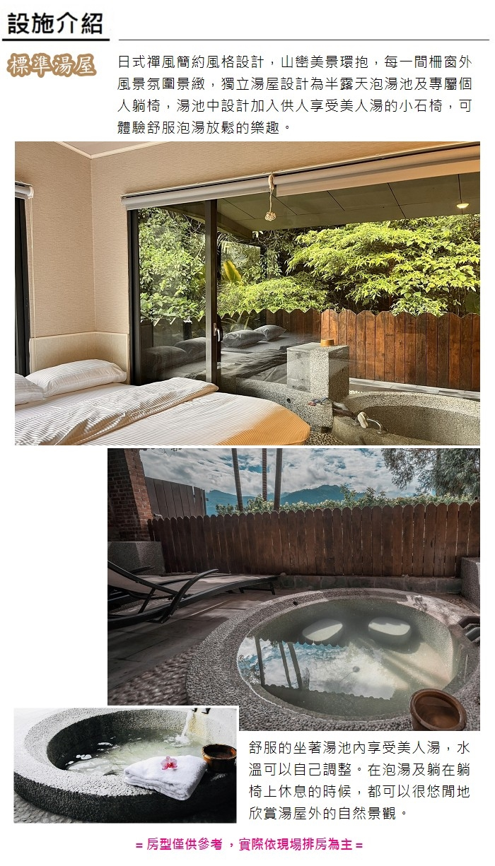 1.本券可雙人泡湯淡季(每年04/01~10/31日)平日(週一~週五)使用標準湯屋90分鐘,