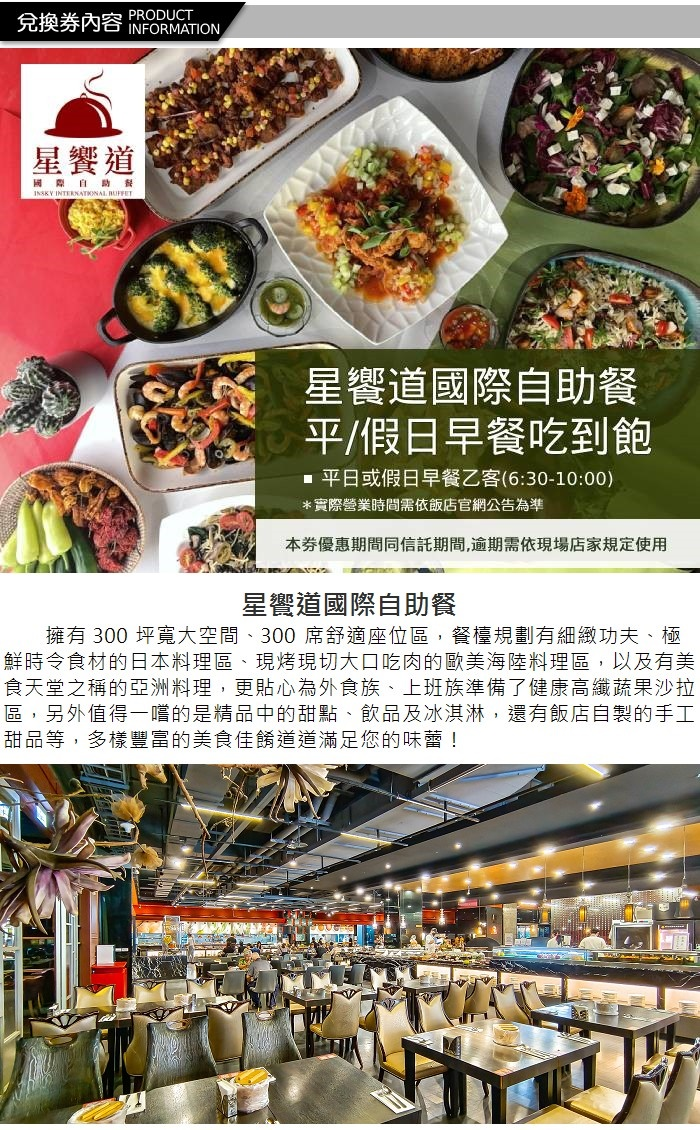 1.單張可於《台中星享道酒店-星饗道國際自助餐》兌換平/假日早餐吃到飽乙客。(已含服務費)
