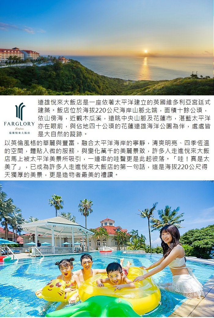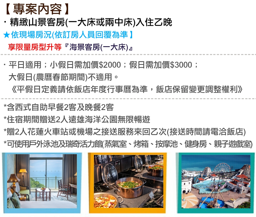1.單張券可2人平日入住花蓮遠雄悅來大飯店-精緻山景客房(一大床或兩中床)乙晚,含西式自助早餐2客及晚餐2客。