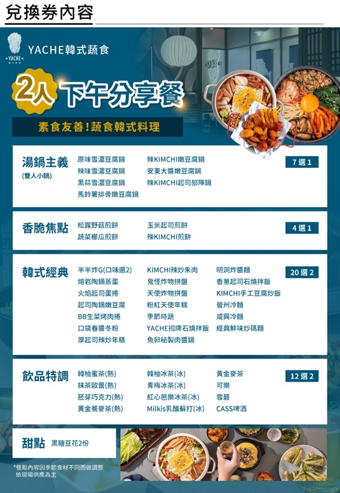 ◎韓式經典(20選2): 1.半半炸G(口味選2)2.熔岩陶鍋蒸蛋3.火焰起司蛋捲4.起司陶鍋嫩豆腐5.BB生菜烤肉捲6.口袋春醬冬粉7.厚起司辣炒年糕8.KIMCHI辣炒朱肉9.鬼怪炸物拼盤10.天使炸物拼盤11.粉紅天使年糕12.季節時蔬13.YACHE招牌石燒拌飯14.魚卵秘製肉醬鍋15.明洞炸醬麵16.香蔥起司石燒拌飯17.KIMCHI手工豆腐炒飯18.晉州冷麵19.咸興冷麵20.經典鮮味炒碼麵