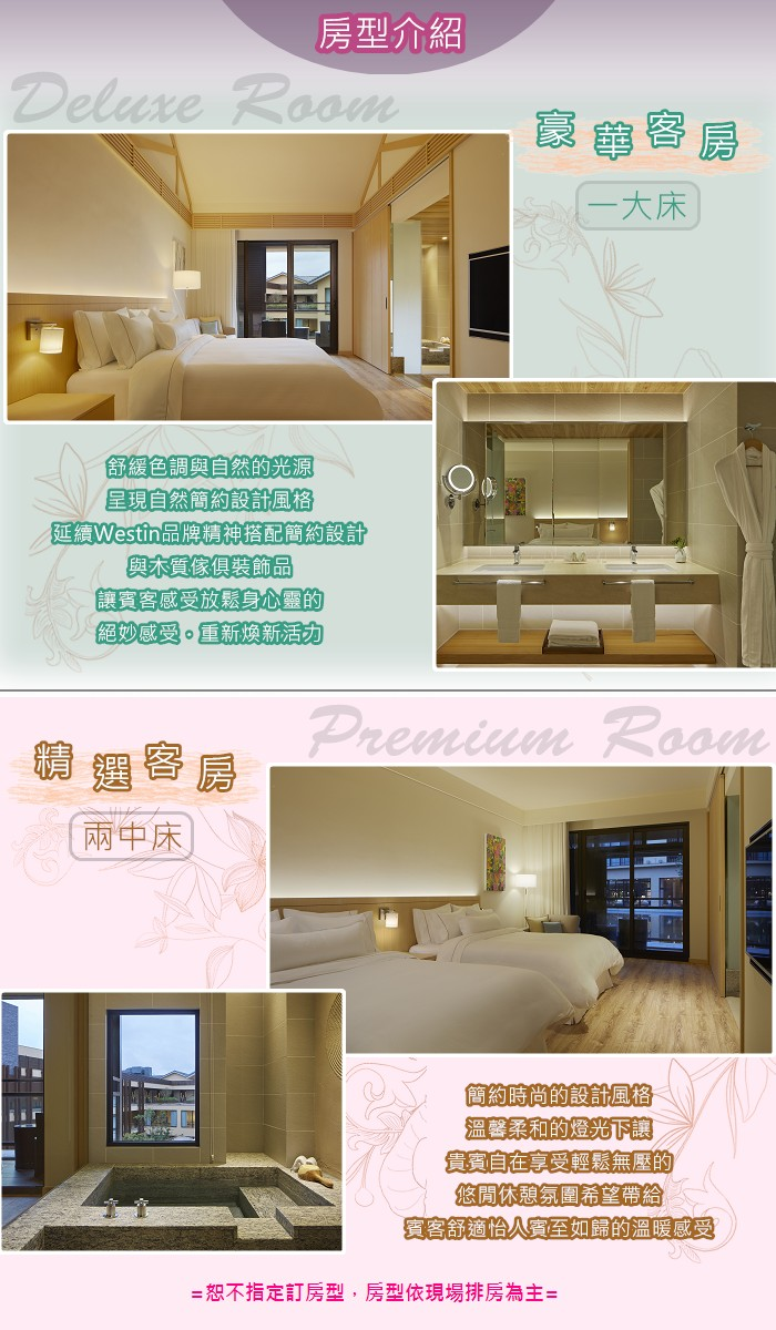 1.單張券可2人於宜蘭力麗威斯汀度假酒店入住《豪華客房或精選客房》乙晚並享專案內容。※房型依現場排房為準,恕不得指定。