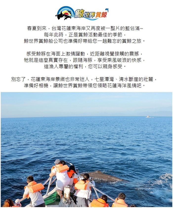 5.賞鯨自行報到地點:向日廣場-花蓮市港濱路35-1號,電話:03-8238000 ‧ 0977-238000
