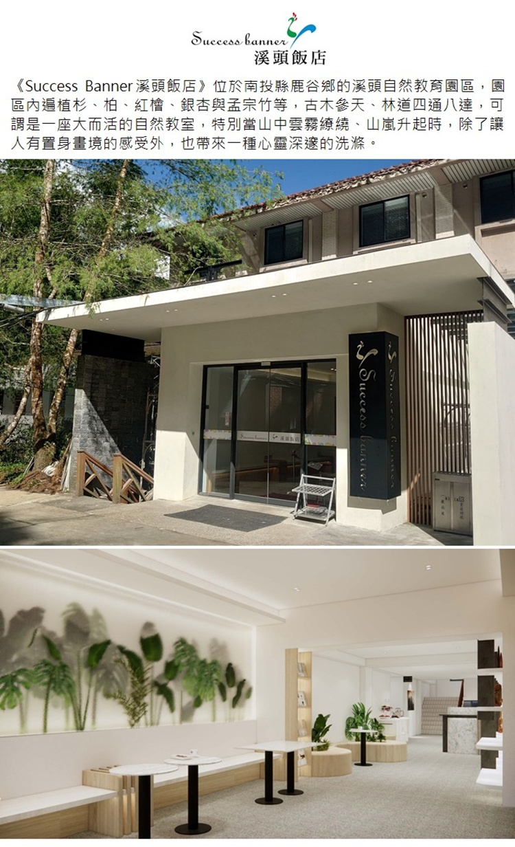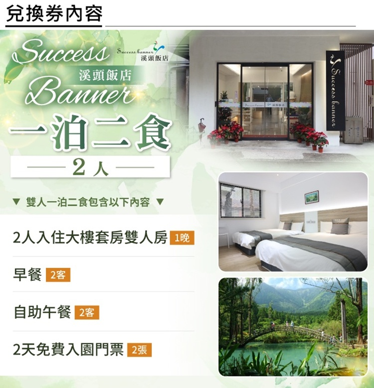 1.單張券可2人至《Success Banner溪頭飯店-大樓套房》入住雙人房乙晚含早餐及自助午餐(入住當天或隔天)、2天免費入園門票。
