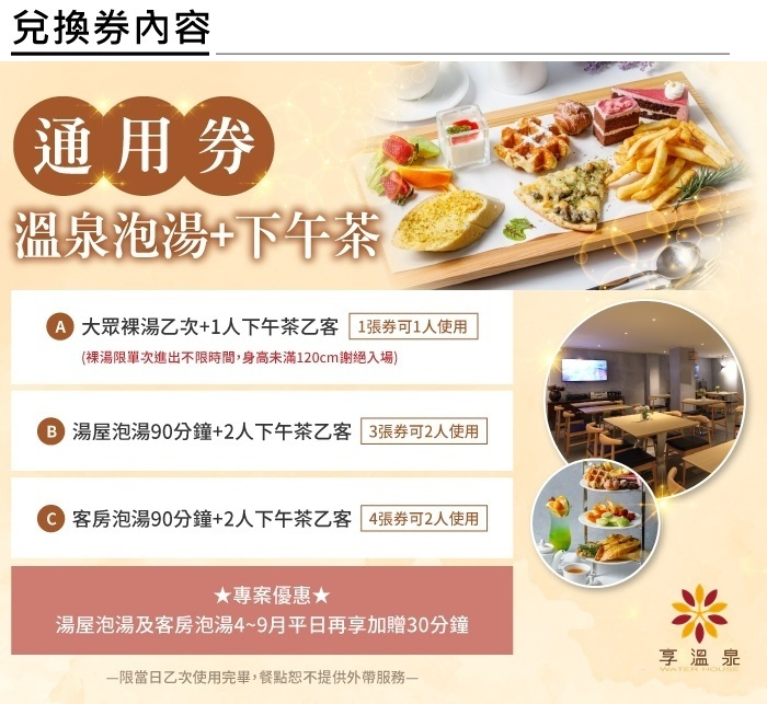 1.本券可於「北投享溫泉」依以下方案擇一使用。(方案內容需當日乙次使用完畢,餐點內容恕不提供外帶服務)