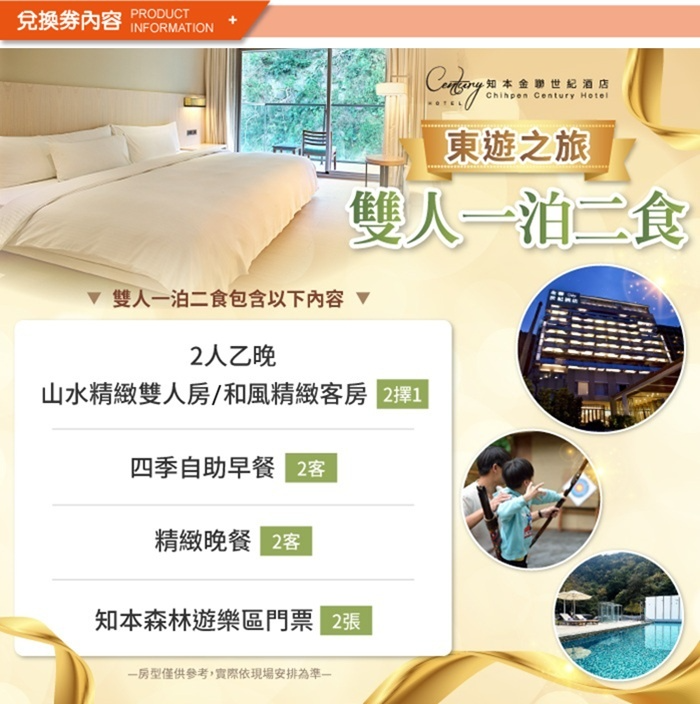 1.本券可2人一間於知本金聯世紀酒店入住山水精緻雙人房或和風精緻客房住宿乙晚(於訂房時確認)附四季自助早餐2客、精緻晚餐2客及知本森林遊樂區門票2張。