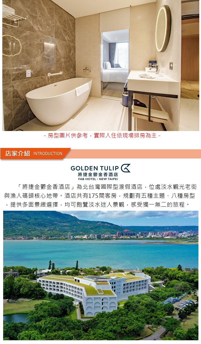1.單張可2人於平日入住《將捷金鬱金香酒店》標準客房或標準雙床客房乙晚,含河畔餐廳早餐2客及滬尾之星雙人下午茶乙套。