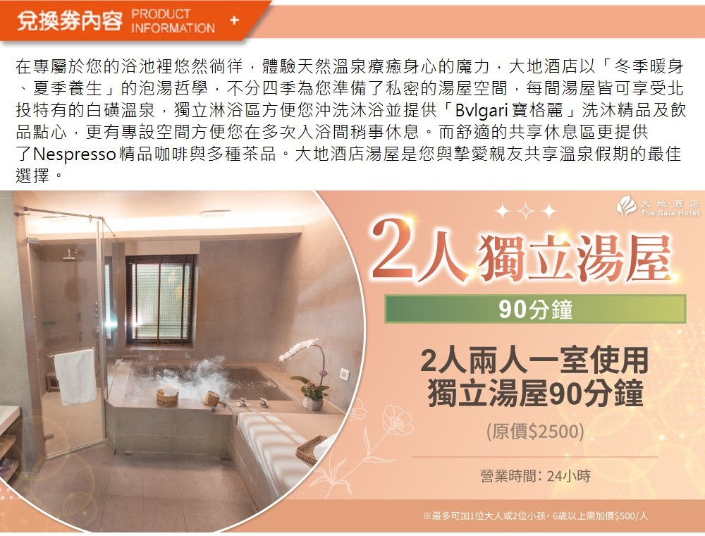 1.單張券可2人於北投大地酒店使用獨立湯屋90分鐘(原價$2500),兩人一室。