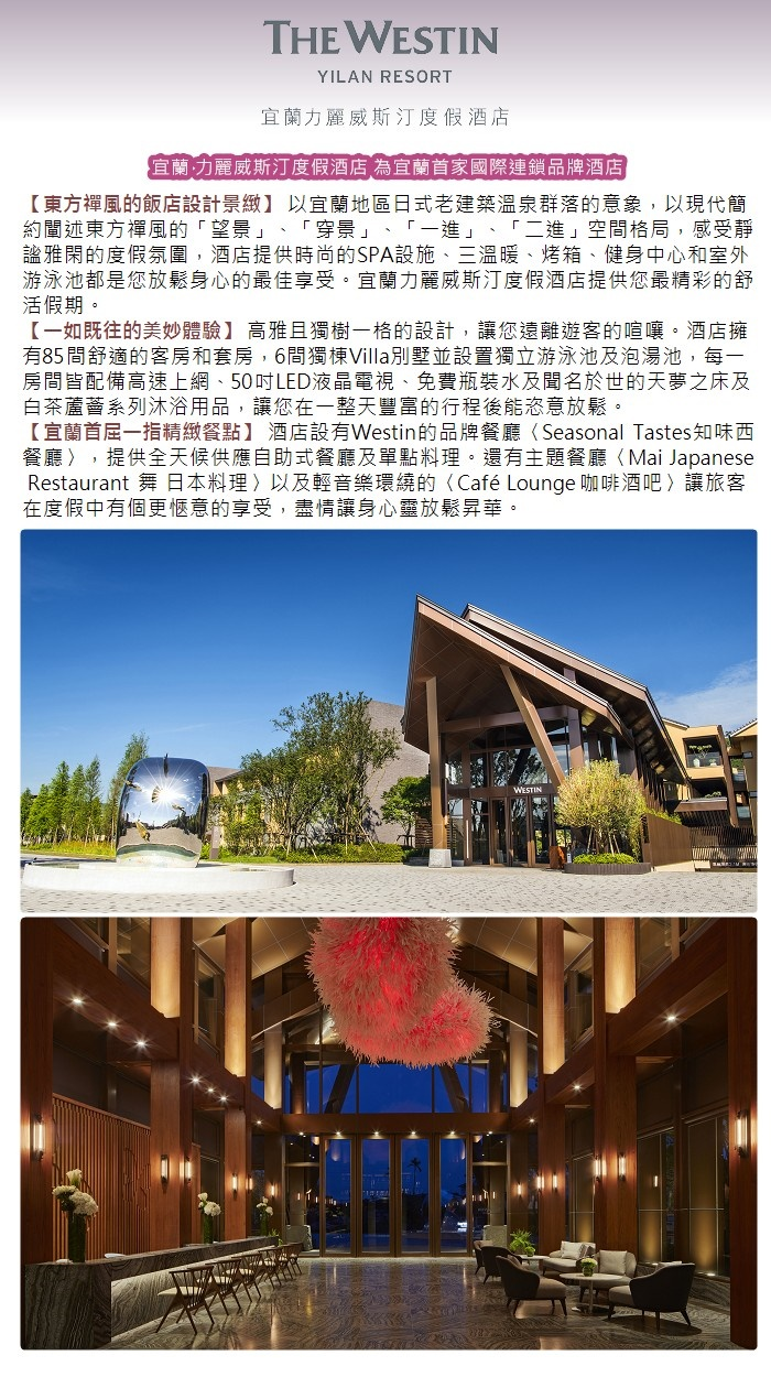宜蘭力麗威斯汀度假酒店為宜蘭首家國際連鎖品牌酒店。 【東方禪風的飯店設計景緻】以宜蘭地區日式老建築溫泉群落的意象,以現代簡約闡述東方禪風的「望景」、「穿景」、「一進」、「二進」空間格局,感受靜謐雅閑的度假氛圍,酒店提供時尚的SPA設施、三溫暖、烤箱、健身中心和室外游泳池都是您放鬆身心的最佳享受。