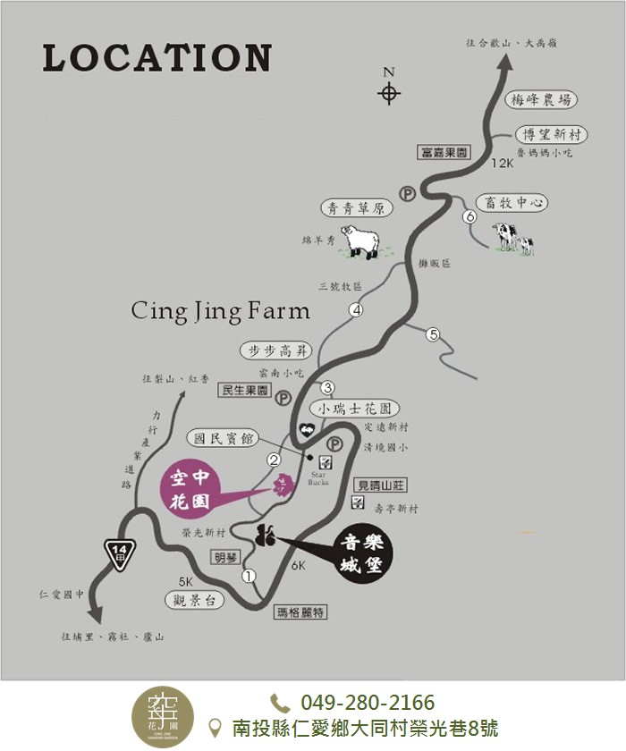 空中花園位於清境的中心點,附近景點的交通便利,不論往上至清境青青草原、合歡山;或往下至廬山溫泉,皆是一個便捷的中繼站;鄰近有7-11、星巴克以及紀念品商圈,為清境較熱鬧的區域。建築設計採美式鄉村木屋建築,原木的風味,溫馨的氣息,有如來到了國外,歡迎您親自體驗~