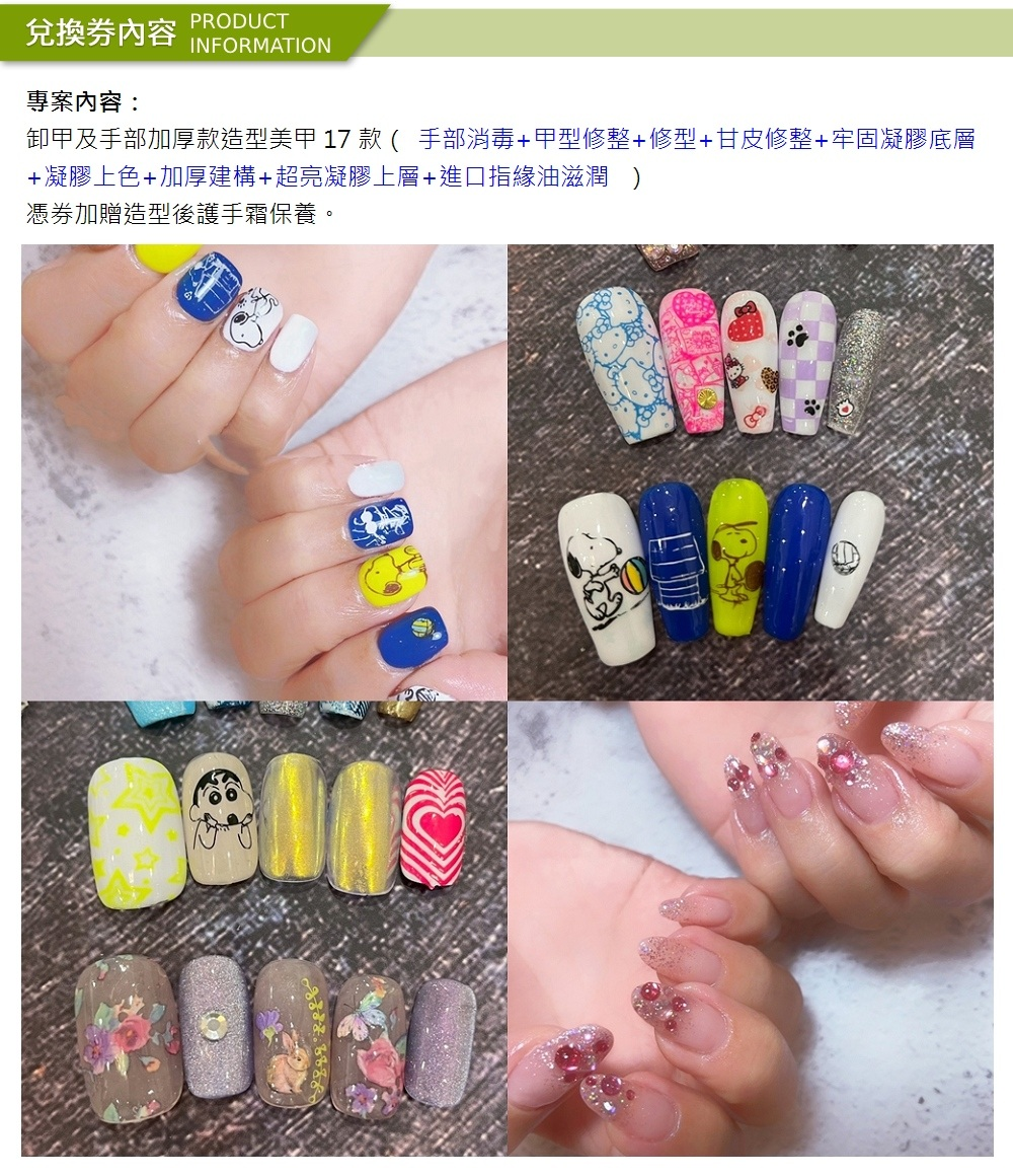 2.專案內容包含:卸甲及手部加厚款造型美甲(手部消毒+甲型修整+修型+甘皮修整+牢固凝膠底層+凝膠上色+加厚建構+超亮凝膠上層+進口指緣油滋潤),憑券加贈造型後護手霜保養。 (以上內容限乙次使用完畢)