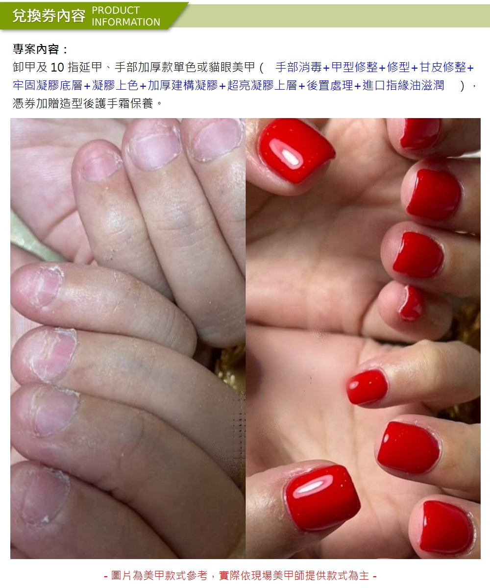 2.專案內容包含:卸甲及10指延甲、手部加厚款單色或貓眼美甲(手部消毒+甲型修整+修型+甘皮修整+牢固凝膠底層+凝膠上色+加厚建構凝膠+超亮凝膠上層+後置處理+進口指緣油滋潤),憑券加贈造型後護手霜保養。 (以上內容限乙次使用完畢)