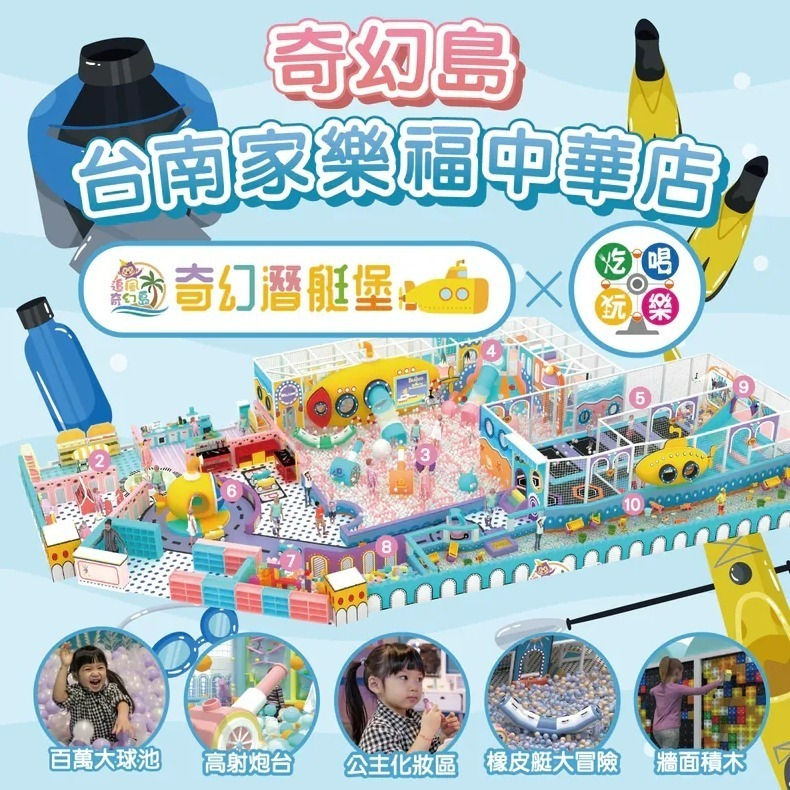 1、每張票券可一大一小全區全日𣈱玩台南家樂福中華店 【奇幻潛艇堡】(六歲以下需全程陪同一位大人入場)。