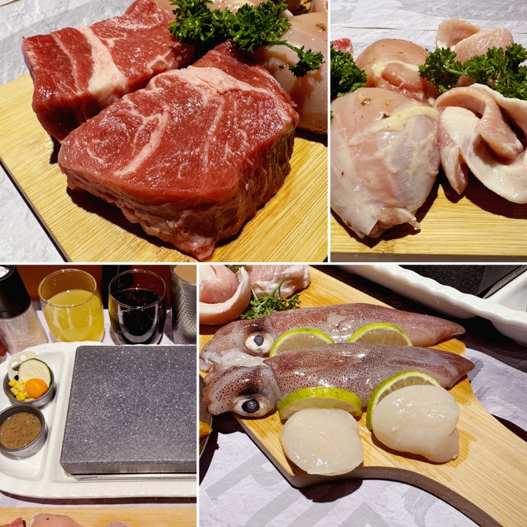●主菜:美國PR頂級丹佛牛排(160g)+西班牙松阪豬(100g)+義式香料雞腿雞(100g)