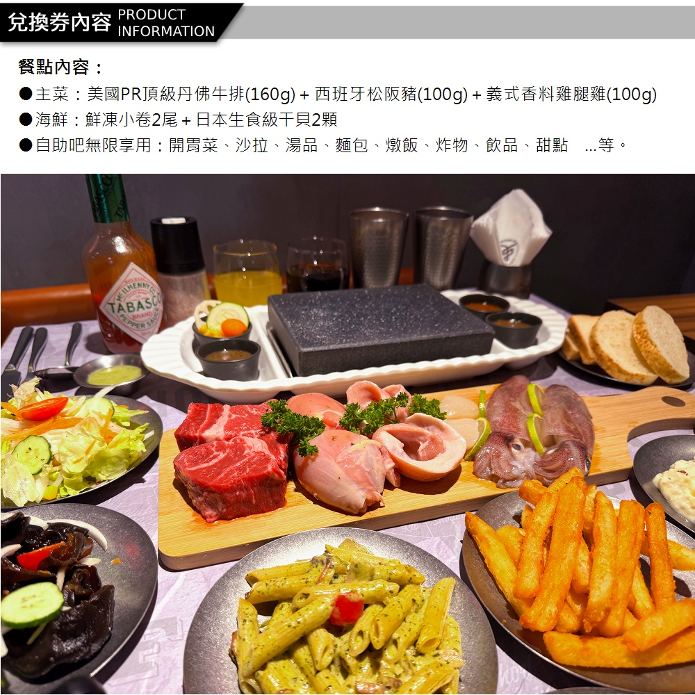 1.單張可2人於《洋石岩燒牛排》享用平日海陸雙人套餐+半自助式吃到飽。(已含服務費)