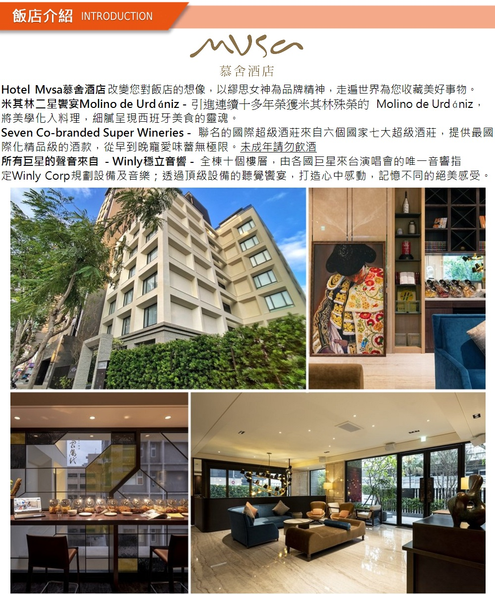 1.本券可2人於慕舍酒店入住都會客房乙晚,含渥達尼斯磨坊Molino de Urdániz 「經典西班牙早餐」2客。