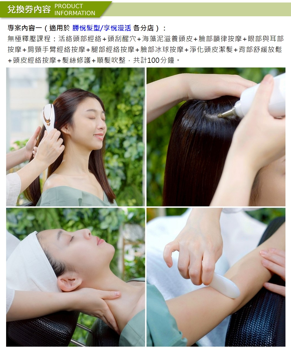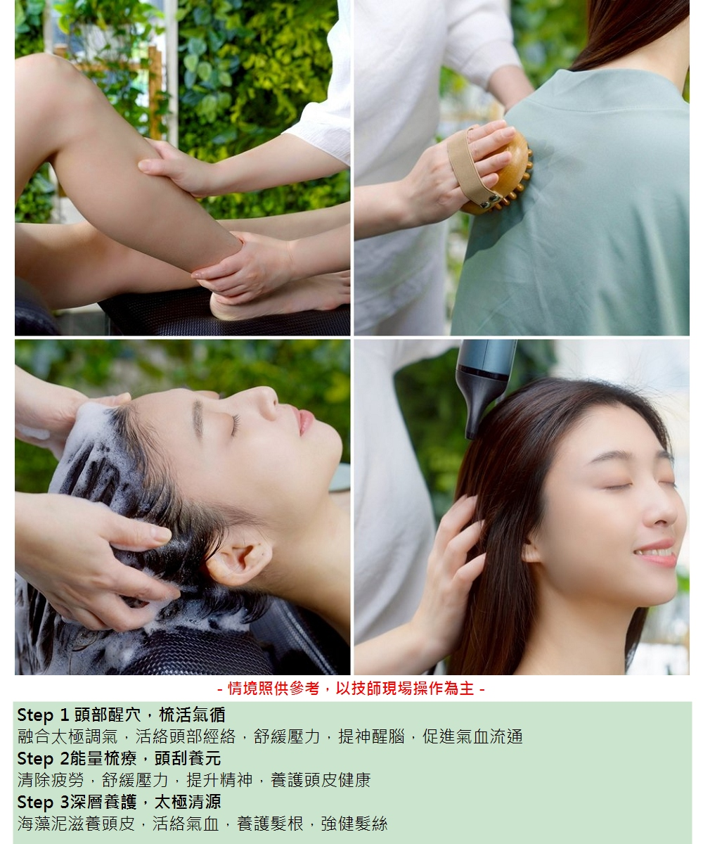 ※無極釋壓課程:活絡頭部經絡+頭刮醒穴+海藻泥滋養頭皮+臉部韻律按摩+眼部與耳部按摩+肩頸手臂經絡按摩+腿部經絡按摩+臉部冰球按摩+淨化頭皮潔髮+背部舒緩放鬆+頭皮經絡按摩+髮絲修護+順髮吹整,共計100分鐘。