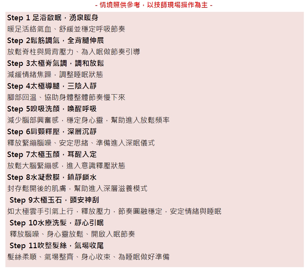 ※深度助眠課程:足浴暖身+背部及腿部按摩放鬆+頭部按摩放鬆+腿部舒緩按摩+芳香精油嗅吸放鬆+肩頸放鬆按摩+頭部舒緩按摩+臉部保濕面膜+頭部玉石刮療+淨化頭皮+順髮吹整,共計100分鐘。