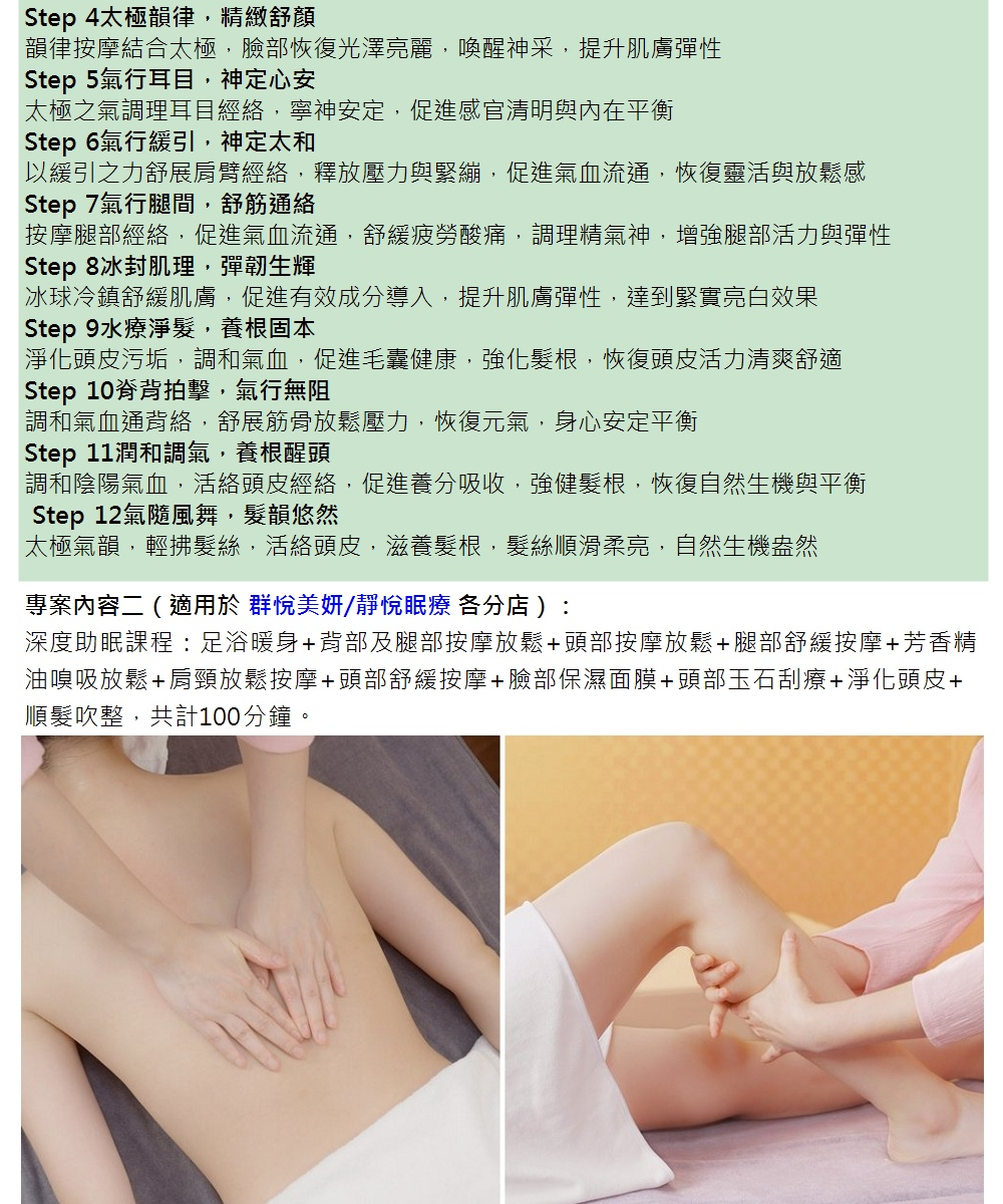 《群悅美妍/靜悅眠療》適用會館資訊請至此網址參考查詢 https://reurl.cc/2Q58VO