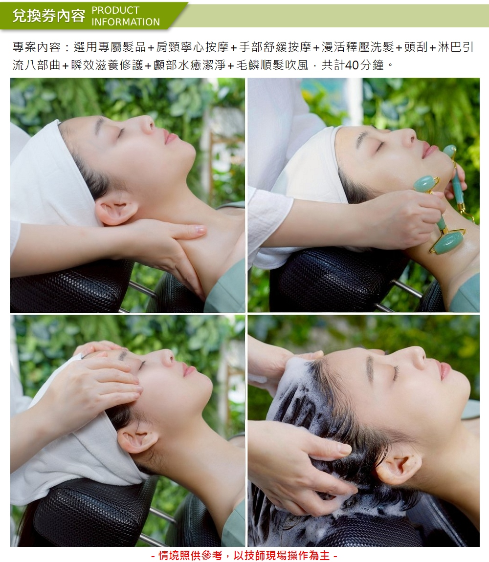 內容:選用專屬髮品+肩頸寧心按摩+手部舒緩按摩+漫活釋壓洗髮+頭刮+淋巴引流八部曲+瞬效滋養修護+顱部水癒潔淨+毛鱗順髮吹風,共計40分鐘。