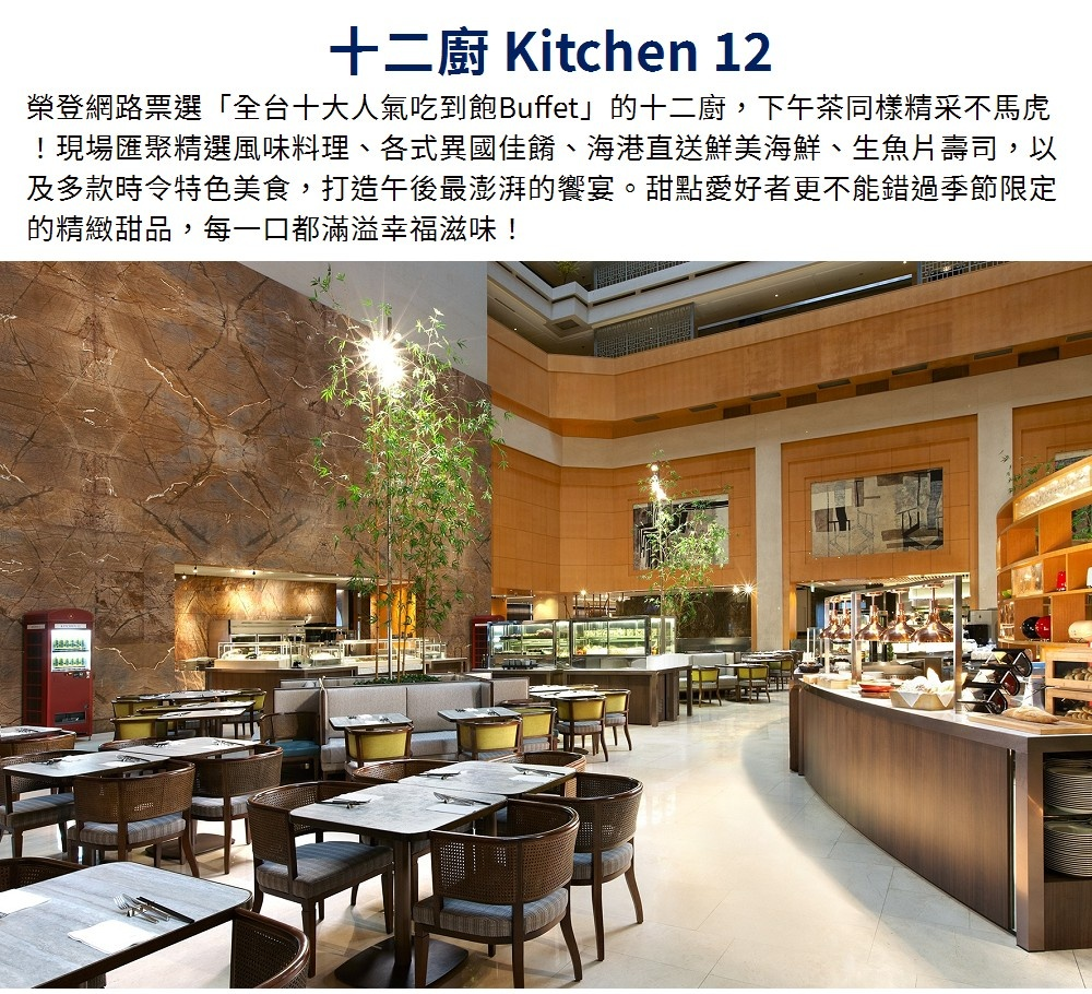 1.適用於台北喜來登大飯店「十二廚」自助餐廳,一人享用假日自助下午茶(週六至週日下午茶),不限成人或兒童。