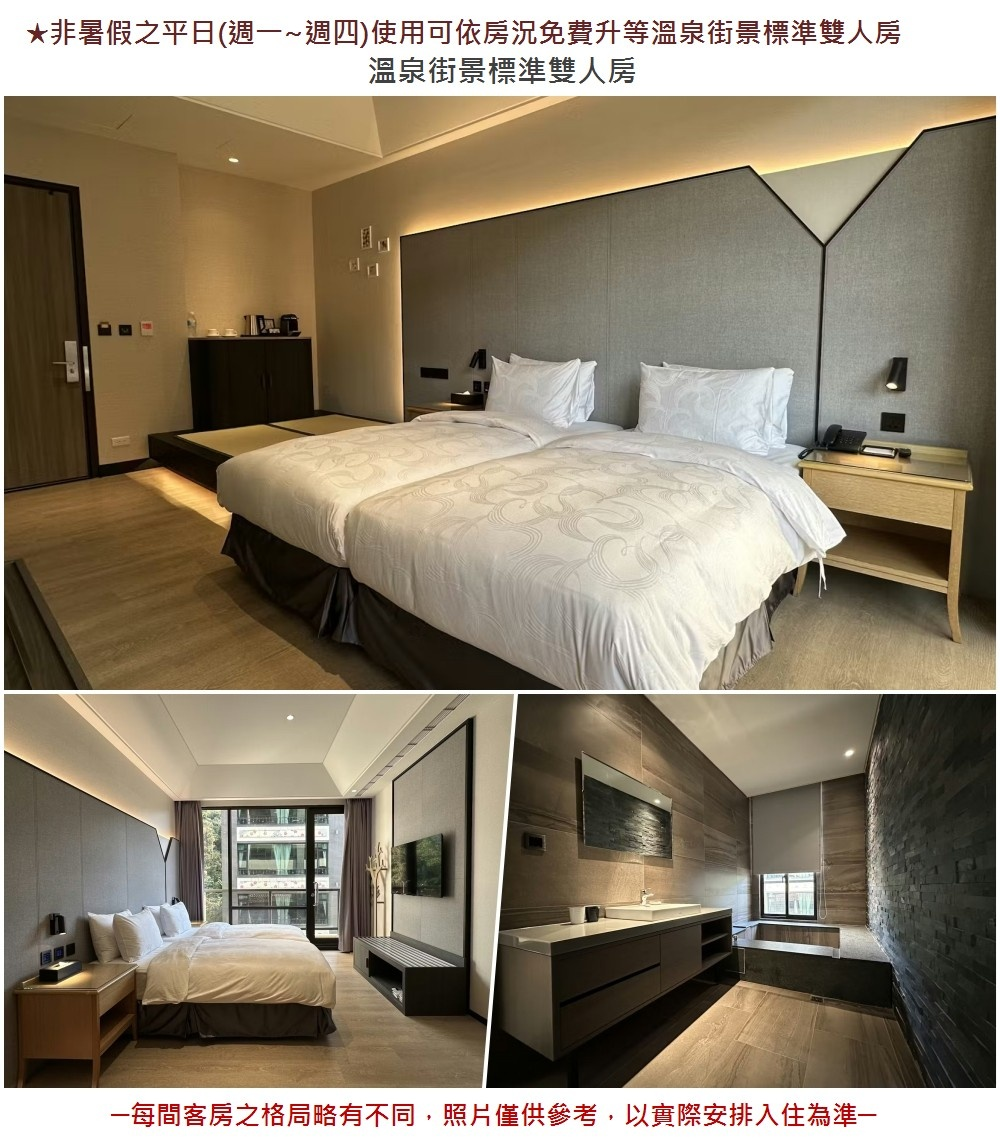 2.本券1~6月&9~12月之平日(週一~週四)使用可依房況免費升等溫泉街景標準雙人房,另可加價$1,200升等溫泉潭景標準雙人房。