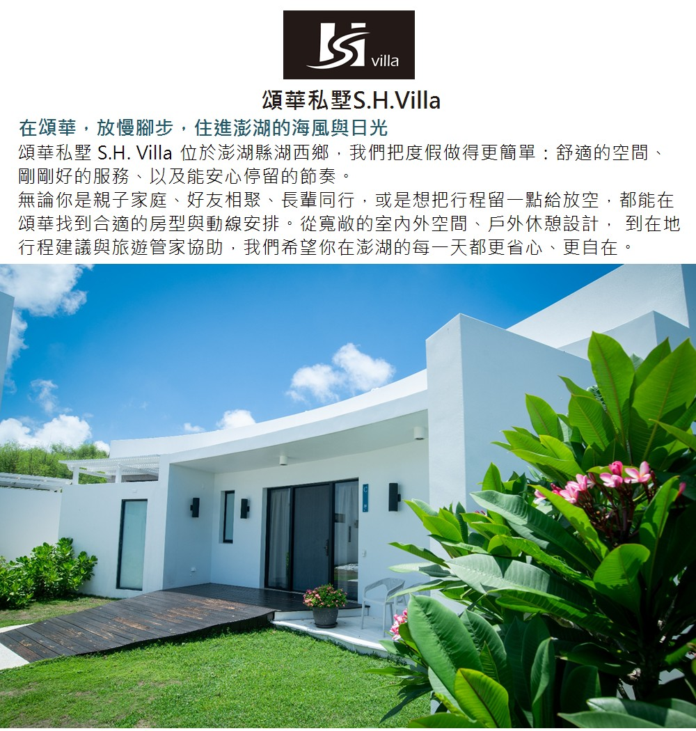 頌華私墅 S.H. Villa 位於澎湖湖西鄉,是一間主打海景的度假旅宿,結合「獨棟別墅」與「面海套房」。別墅區附有私人戲水池與廚房,適合包棟;面海房型則強調舒適景觀,提供優質的放鬆空間與旅遊管家服務,讓旅人能自在慢活。