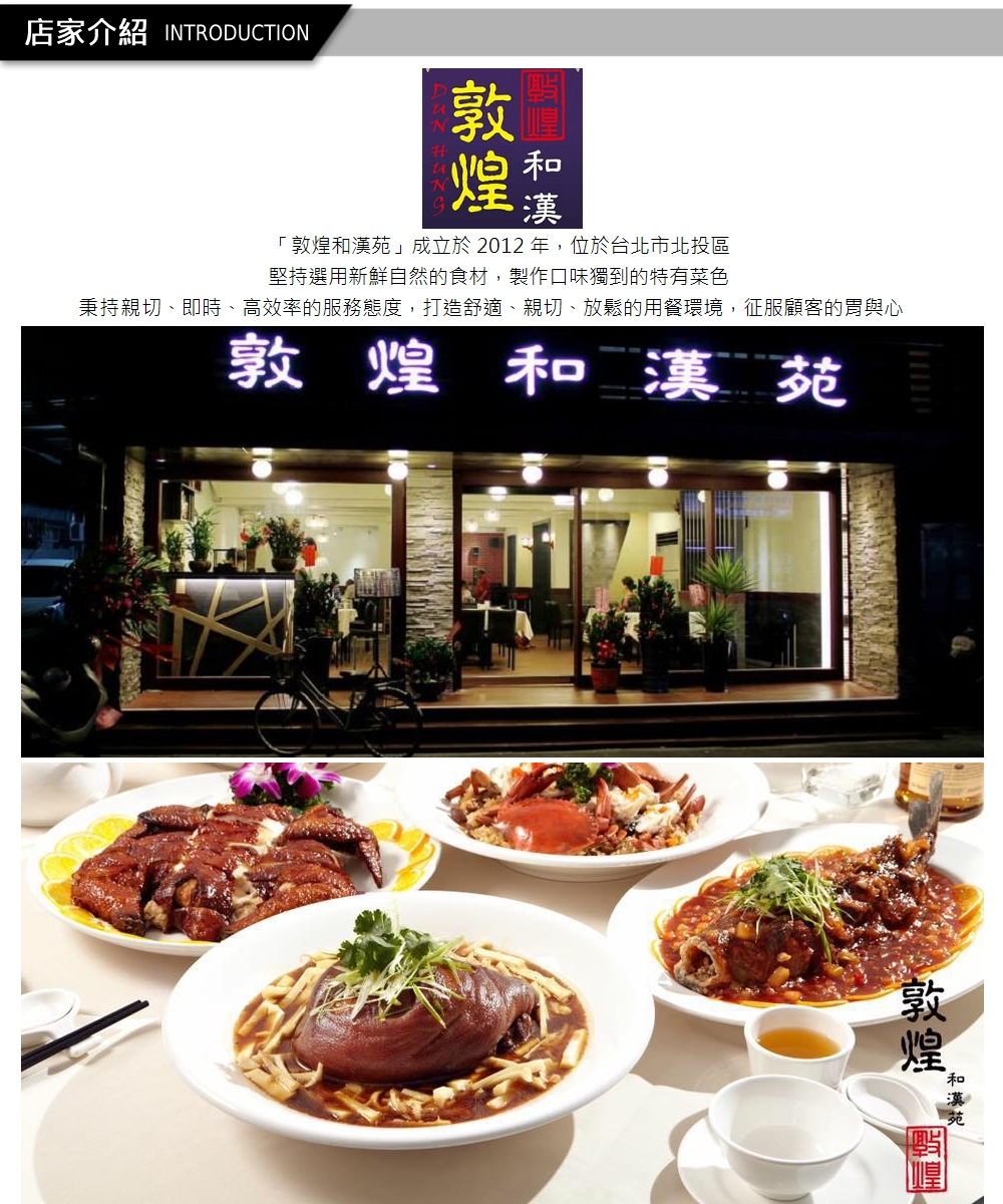 敦煌和漢苑位於台北市北投區,是一間主打中式料理與台式熱炒的餐廳,提供從日常小吃到宴會桌菜的多元選擇。餐廳強調使用新鮮食材與師傅手藝,打造口味扎實、適合聚餐分享的料理。店內招牌包含脆皮雞、紅燒獅子頭、海鮮煲等經典中式菜色,份量適合多人用餐,也常推出合菜或套餐,是在地家庭聚餐與朋友聚會的熱門選擇。