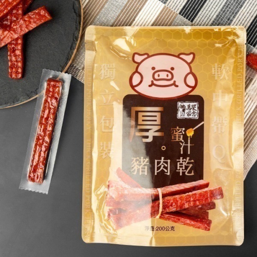 每一條都有獨立真空包裝! 加上獨門秘方和香甜蜜之使豬肉的肉香濃郁、色澤誘人。 選用台灣豬後腿肉,製成厚達1cm的肉條,Q彈蘊含肉汁。