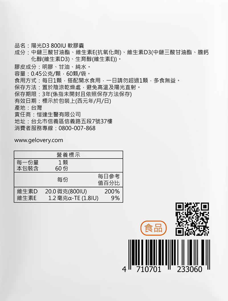 【關鍵成份(每份)】 維生素D(D3) 800 IU (國內最高上限) 維生素E 1.2毫克