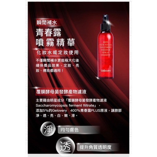 添加5%的Gelovery 400%青春露PLUS原液,讓臉部淨、透、亮、白、嫩、滑,不僅瞬間補水更能極大化後續保養品效果,定妝、亮妝、裸妝都適用!
