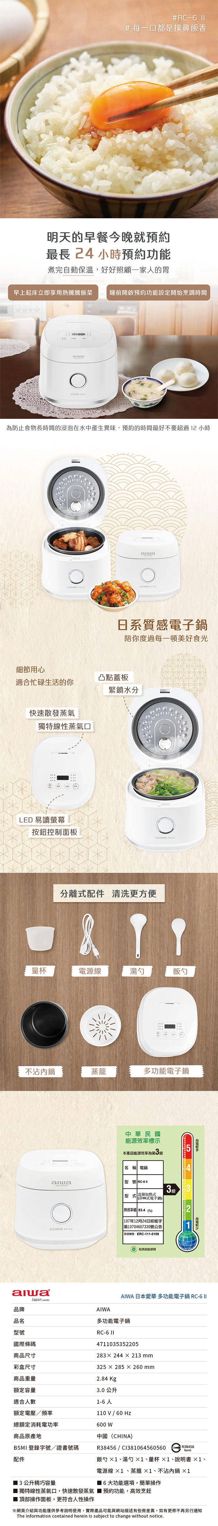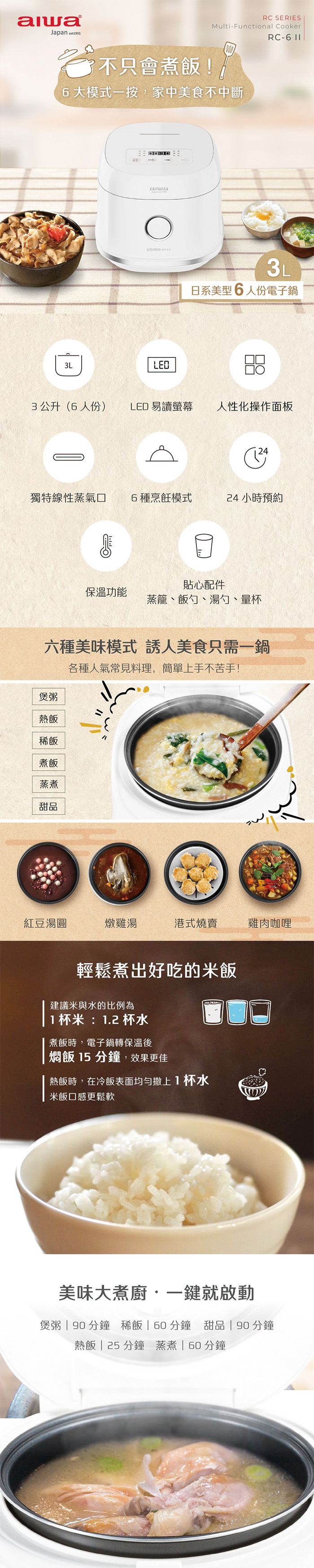【AIWA 愛華】 3L 微電腦多功能電子鍋 RC-6 Ⅱ 煮飯 | 粥 | 稀飯 | 蒸煮 | 熱飯 | 甜品