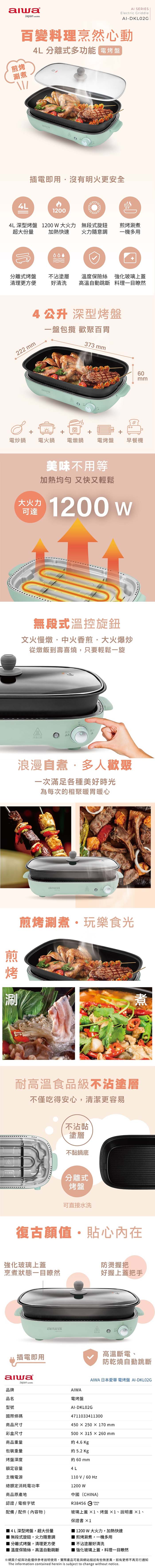 【AIWA 愛華】 4L 電烤盤 AI-DKL02G 深型烤盤 分離式設計