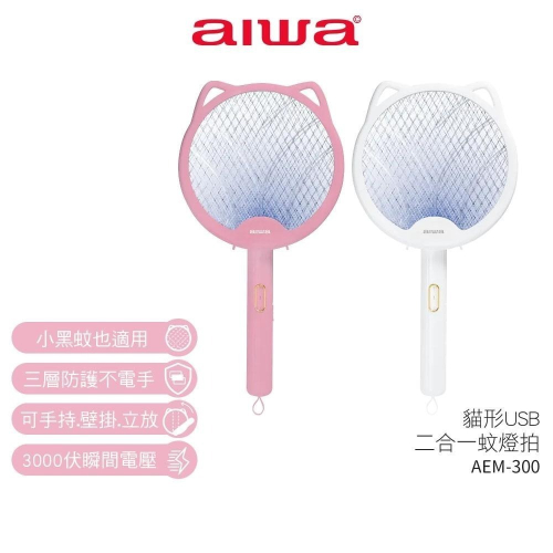 【AIWA愛華】貓形USB 二合一蚊燈拍 AEM-300 粉/白 捕蚊燈 補蚊拍 公司貨