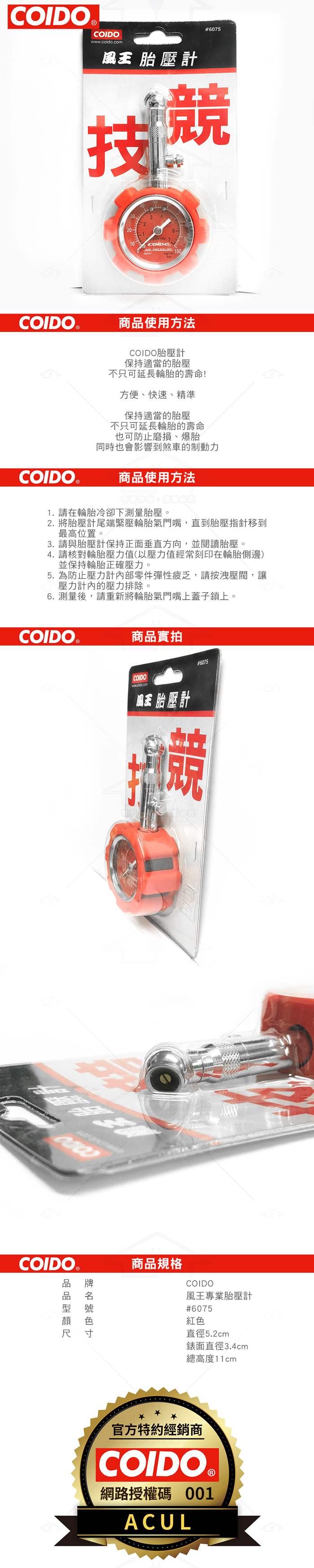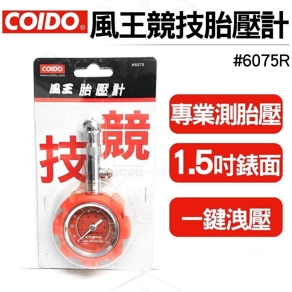 COIDO 風王專業胎壓計 6075R 紅色 胎壓表 | 1.5吋錶面 | 一鍵洩壓 | 胎壓計