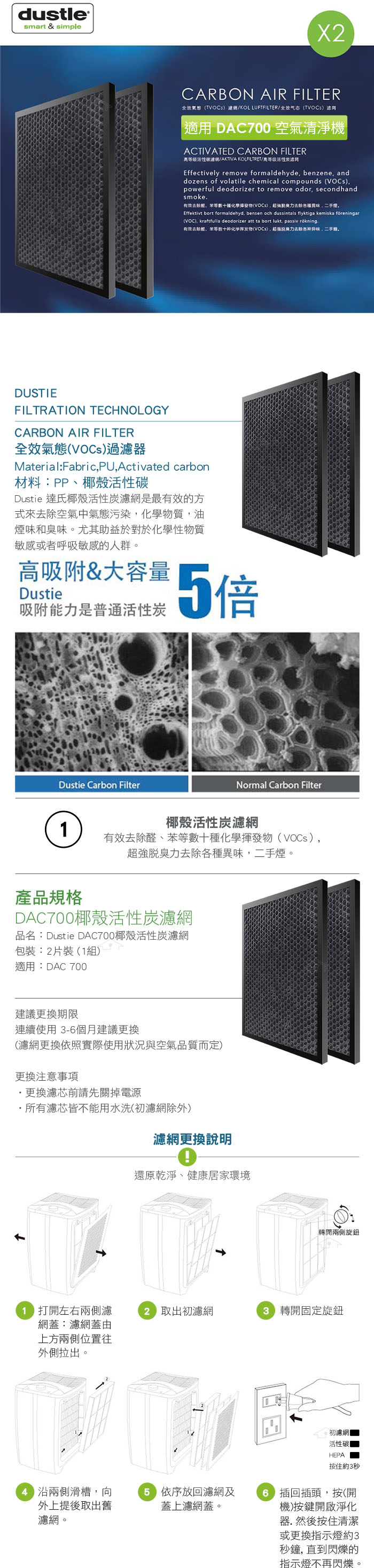 Dustie 達氏 椰殼活性碳濾網 DAFR-80ML-X2 適用DAC700清淨機 原DAFR-24CA-X2