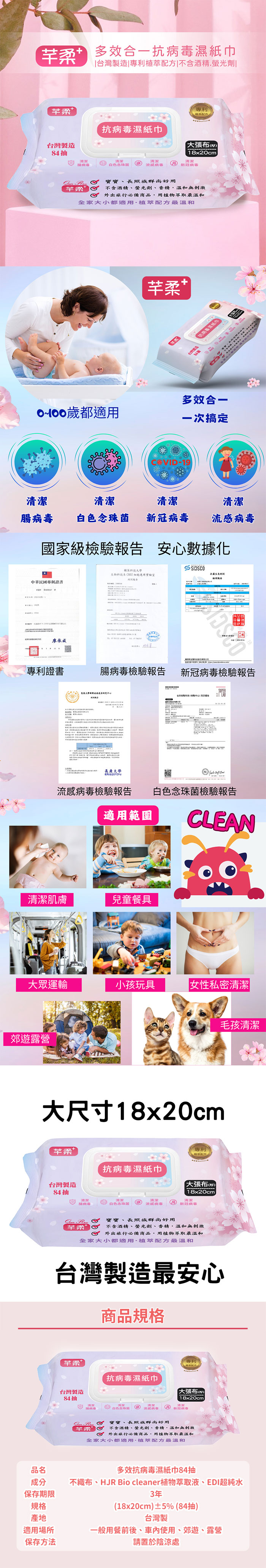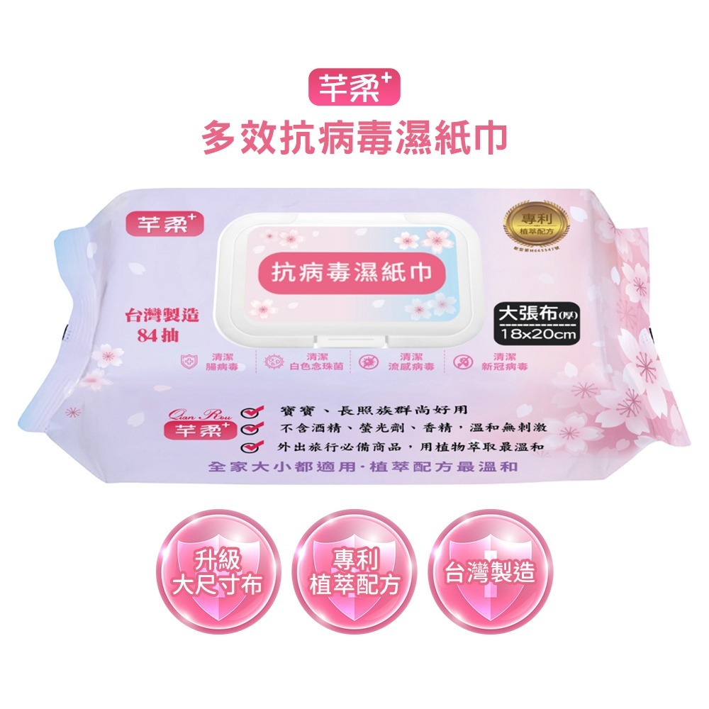 芊柔+ Plus升級版 多效抗病毒濕紙巾 附蓋 84抽 (一箱8包箱出) 腸病毒、流感、新冠、白色念珠菌